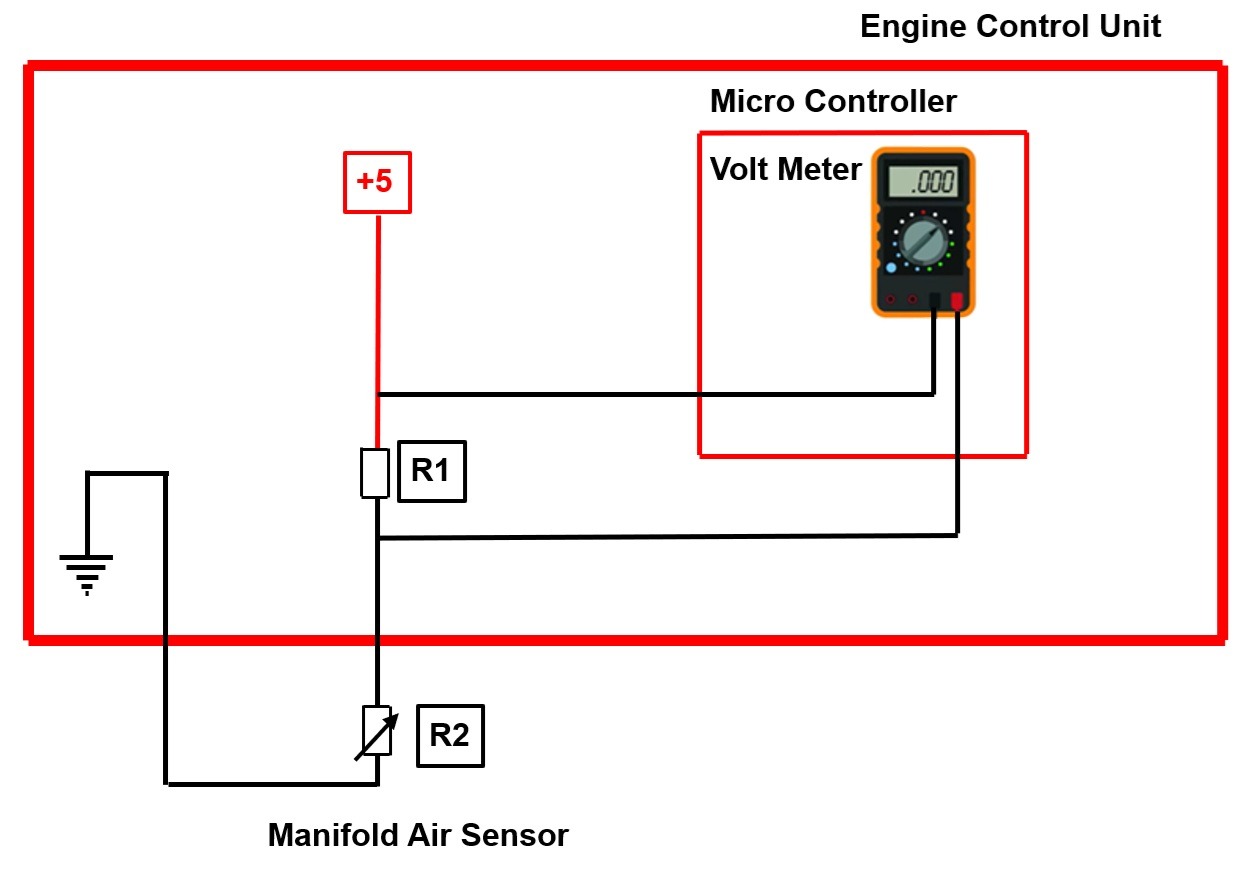 اختلافپتانسیل دو سر مقاومت ثابت R1، توسط ولتمتر موجود در میکروکنترلر محاسبه میگردد و به کامپیوتر موتور ارسال میگردد، کامپیوتر موتور با توجه به الگوریتمی که در آن تعریف شده است، میزان پاشش انژکتور را تنظیم میکند. علت قرار دادن یک مقاومت در کامپیوتر موتور و محاسبه اختلاف پتانسیل دو سر آن توسط میکروکنترلر این است که میکروکنترلر و الگوریتم آن، بر اساس تغییرات ولتاژ طراحی شده است، به عبارت دیگر، میکروکنترلر فقط می تواند زبان ولتاژ را درک نماید و توانائی فهم مقاومت را ندارد.